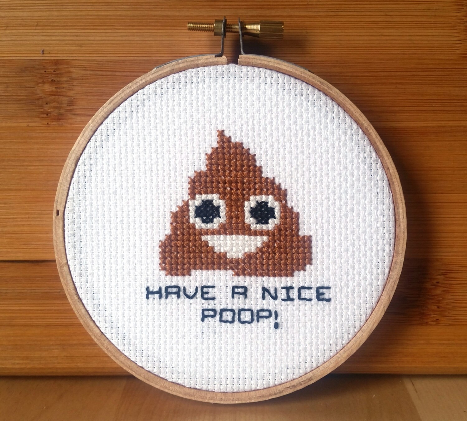 - CC receives a poo emoji cross stitch, wrapped in a plain brown paper bag, tied up with some lightly used rope.